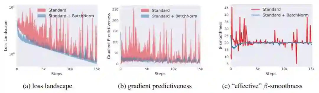 之后研究者将注意力转向确定 BatchNorm 成功的原因上。具体而言,研究者证明 BatchNorm 以一种基础的方式影响着网络的训练:它使相关优化问题的解空间更平滑了。这确保梯度更具预测性,从而允许使用更大范围的学习率,实现更快的网络收敛。该研究提供这些发现的经验性证明和理论依据。该研究证明了,在自然条件下,有 BatchNorm 的模型改善了损失和梯度的 Lipschitzness(也称为 β 平滑)。