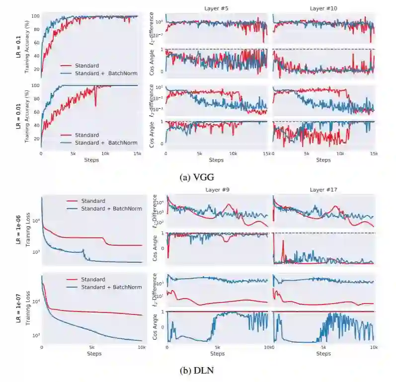 图 3:在有 BatchNorm 层和没有 BatchNorm 层的网络中测量 ICS。对于某一个层,我们测量之前层更新前后的梯度的余弦值(理想情况是 1)和 l_2 差异(理想情况是 0)。尽管从准确率和损失上讲有 BatchNorm 的模型表现更好,但有 BatchNorm 的模型和没有 BatchNorm 的模型的内部协方差偏移情况差不多,甚至更差。(在训练期间 BatchNorm 稳定得更快是参数收敛造成的。)