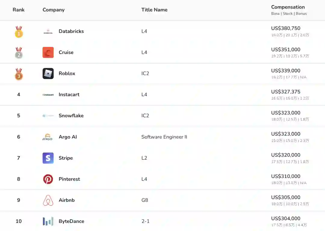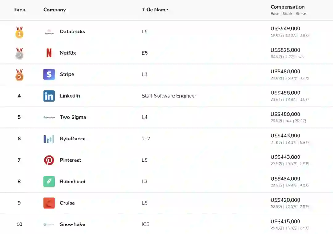 美国企业软件公司Databricks为高级工程师开出的年薪中位数为54.9万美元,位列第一。字节跳动以44.3万美元(约303万元)名列第6,对应工程师级别为2-2。