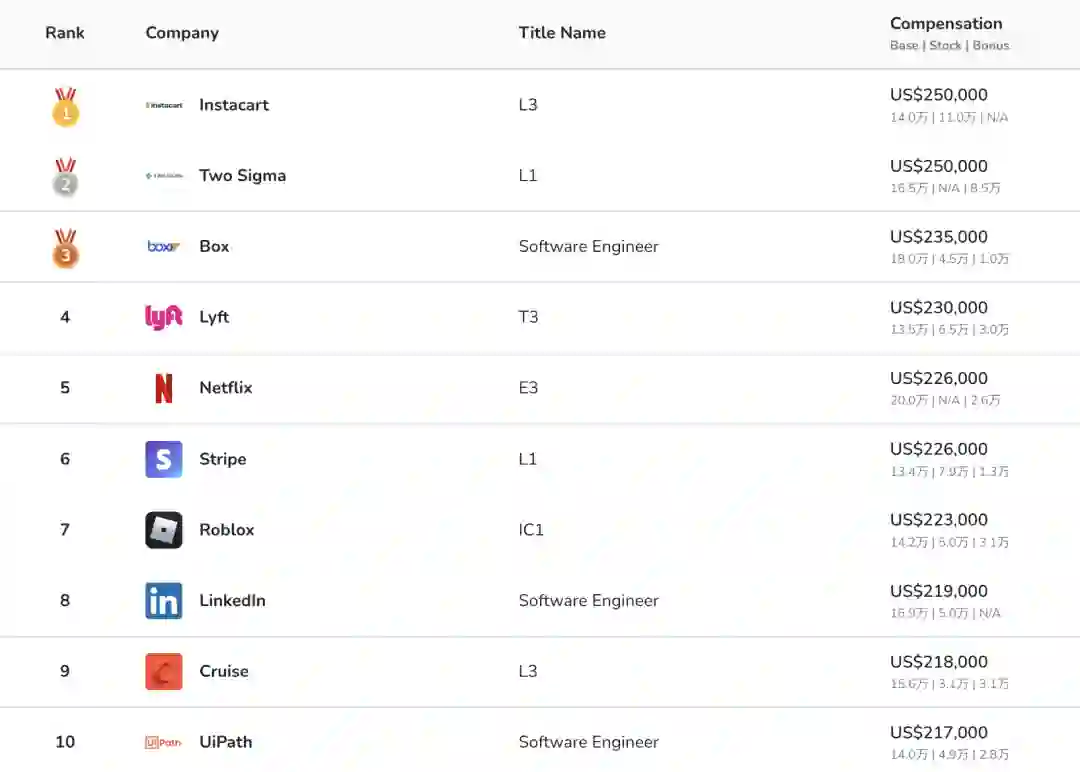 排名前十的公司中,可以看出为这些经验较少的程序员开出年薪中位数均都超过了20万美元(约137万元),其中就包括Roblox、Linkedin、网飞等有名企业。提供零售配货服务的Instacart以25万美元居首。