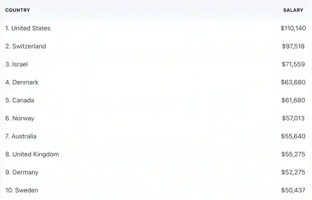 根据codesubmit数据,美国位列榜首,开发者平均薪酬为11万美元(75万元),瑞士和其他几个欧洲国家则紧随其后。