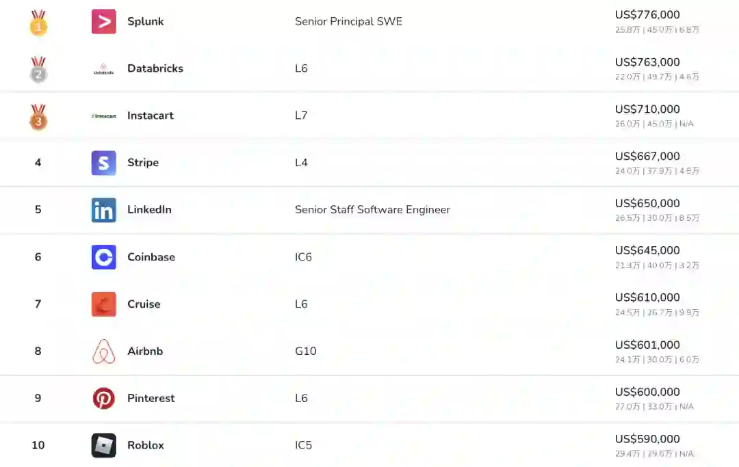 数据显示,字节跳动高级工程师年薪44.3万美元(303万元)位列第6,Roblox为首席工程师开出了120万美元(823万元)的天价。