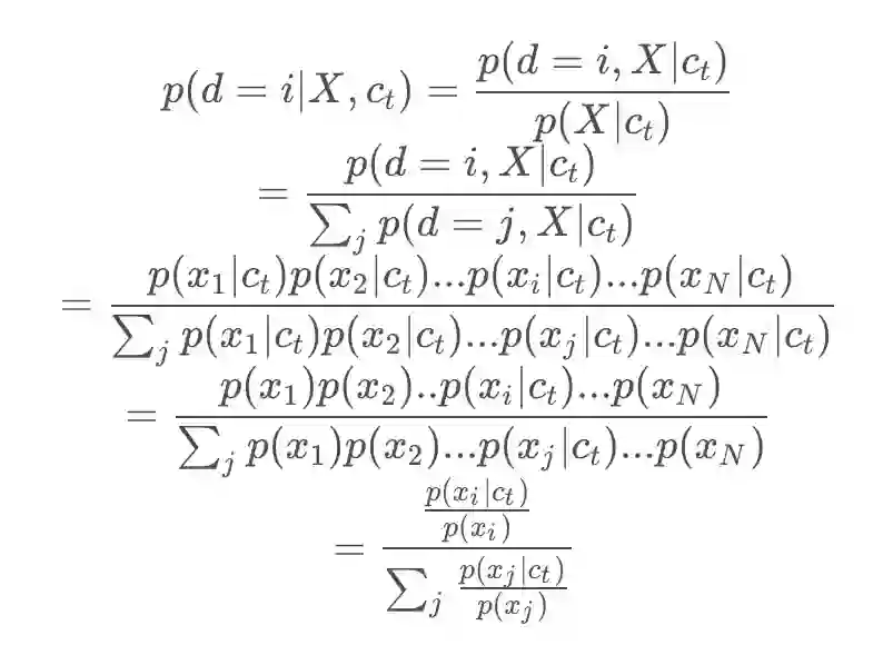 实际上一毛一样,用 f 表示上面的 exp 函数,上面 当做是文本 anchor,假设第 i 个是正样本。给定 ,中 采样自p(x),是不相关的负样本,而 采样于 ,是正样本。当我们想从这一堆 X 样本中找到第 i 个即正例的概率是: