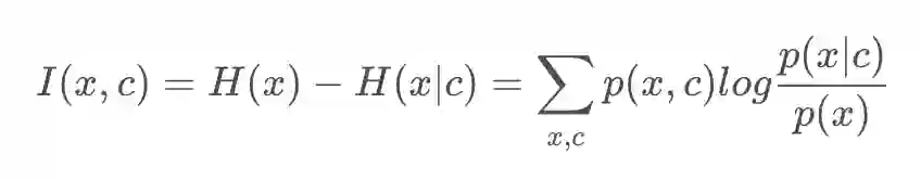 首先介绍互信息。两个变量的互信息是变量间相互依赖性的量度,互信息用来度量两个事件集合之间的相关性。它度量 X 和 Y 共享的信息,比如知道其中一个变量后,对另一个变量不确定度减少的程度。当 X 和 Y 相互独立,则 X 的存在对 Y 不提供任何信息,此时互信息为 0。X 和 Y 的互信息数学定义如下,我们只考虑离散变量(连续变量时,就是积分形式):