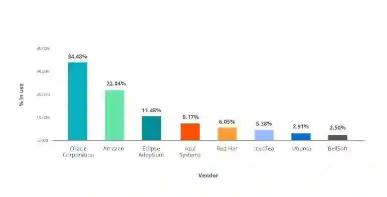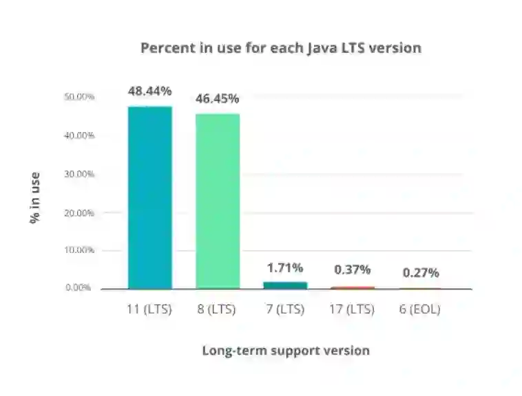 对于非 LTS 版本,最流行的似乎是 Java 14,其次是 Java 15 和 Java 12,但它们的采用率低于 1%。从 Java 9 开始,新的版本发布以 6 个月为周期,但这些版本都将一直受支持到下一次迭代。许多供应商在支持结束后不提供对非 LTS 版本的支持,这可能解释了为什么非 LTS 版本采用率较低。