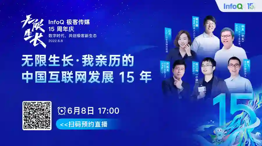 6 月 8 日(周三)下午 5 点,InfoQ 15 周年特邀大咖直播来了~极客邦科技创始人 /CEO 霍太稳对话阿里合伙人蒋江伟(小邪) 、“ CCF 杰出工程师奖”获得者 林昊(毕玄),还有前苏宁易购 CTO & 彩食鲜 CTO 乔新亮、经纬中国合伙人 熊飞一起现身直播间,从大咖视角窥探中国互联网的发展进程。【识别图中二维码预约直播】,干货分享不容错过!