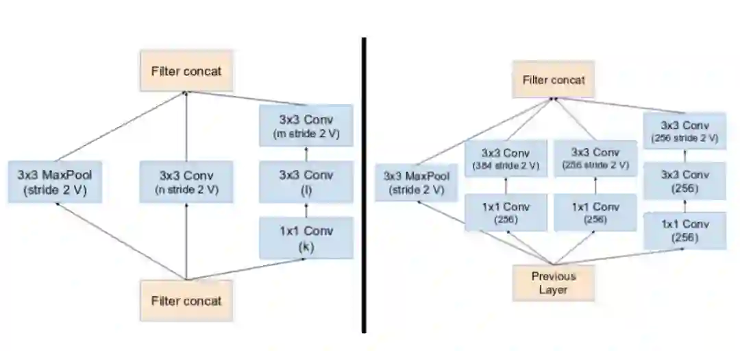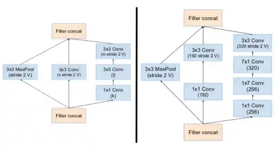 (左起)缩减块 A(从 35x35 到 17x17 的尺寸缩减)和缩减块 B(从 17x17 到 8x8 的尺寸缩减)。这里参考了论文中的相同超参数设置(V,I,K)。(图源:https://arxiv.org/pdf/1602.07261.pdf)