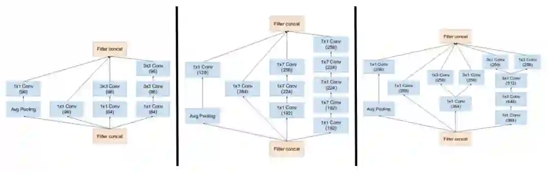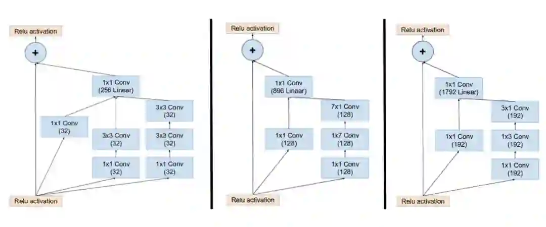 (左起)Inception ResNet 中的 Inception 模块 A、B、C。注意池化层被残差连接所替代,并在残差加运算之前有额外的 1x1 卷积。(图源:https://arxiv.org/pdf/1602.07261.pdf)