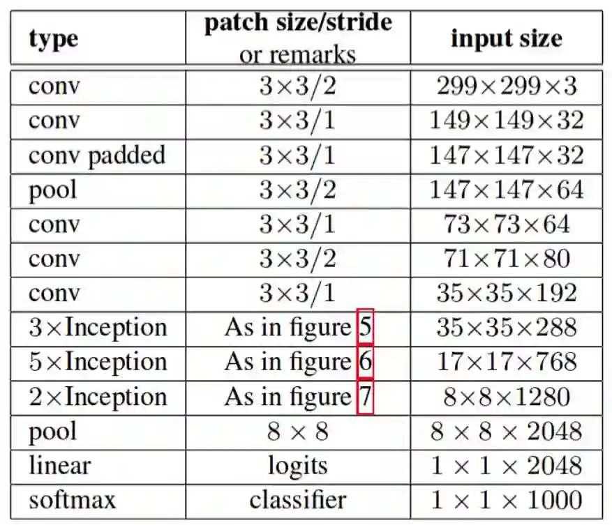 它们有三个主要的 Inception 模块,称为 A、B 和 C(和 Inception v2 不同,这些模块确实被命名为 A、B 和 C)。它们看起来和 Inception v2(或 v3)变体非常相似。