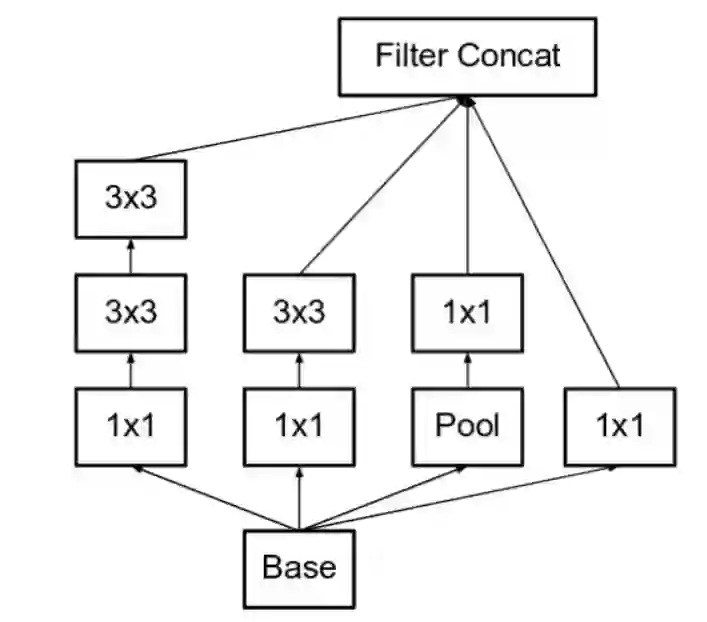 最左侧前一版 Inception 模块中的 5×5 卷积变成了两个 3×3 卷积的堆叠。(图源:https://arxiv.org/pdf/1512.00567v3.pdf)