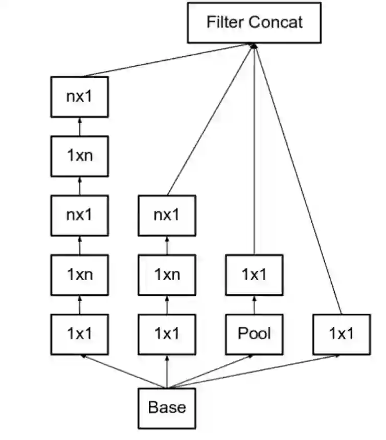 此处如果 n=3,则与上一张图像一致。最左侧的 5x5 卷积可被表示为两个 3x3 卷积,它们又可以被表示为 1x3 和 3x1 卷积。(图源:https://arxiv.org/pdf/1512.00567v3.pdf)