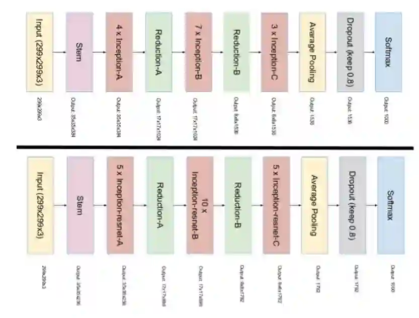 Inception v4 和 Inception -ResNet 在同一篇论文《Inception-v4, Inception-ResNet and the Impact of Residual Connections on Learning》中介绍。为清晰起见,我们分成两个部分来介绍。