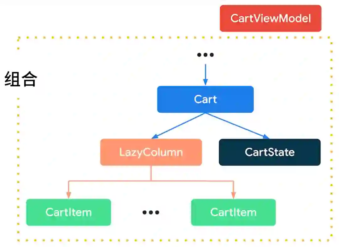 fun CartItem(quantity: Int, // 状态incrementQuantity: () -> Unit, // 事件decrementQuantity: () -> Unit // 事件) {Row {Button(onClick = incrementQuantity) {Text("+")}Text(quantity.toString())Button(onClick = decrementQuantity) {Text("-")}}}