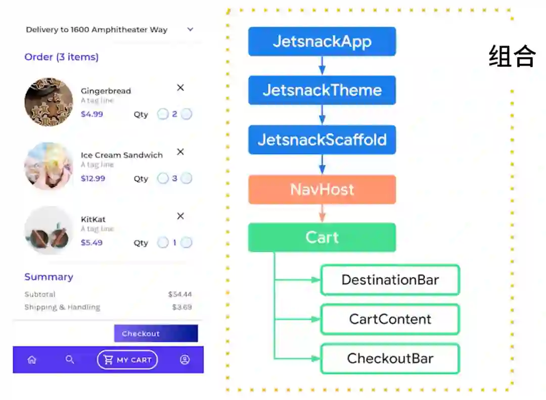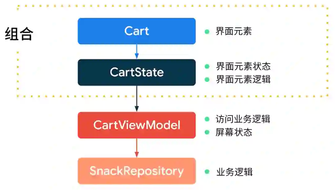 Cart 中同时使用了 ViewModel 和其他状态容器,它们具有不同的用途,并可以协同工作。我们来仔细看一下它们的生命周期: CartState 会遵循 Cart 可组合项的生命周期,当 Cart 从组合中移除后 CartState 也会一同移除;而 CartViewModel 具有不同的生命周期,即导航目的地、导航图、Fragment 或 Activity 的生命周期:
