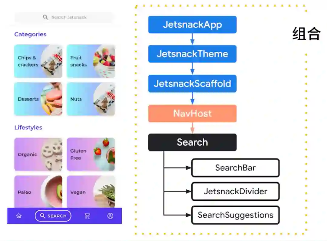 Jetsnack 是一款使用 Compose 构建的小吃订购示例应用,状态对它来说非常重要。比如,在一屏中显示哪些商品、显示用户筛选的小吃以及记录购物车等操作,都需要状态的支持。我们将 Compose 构建的界面称之为组合 (Composition),它会在屏幕中呈现应用的当前状态。下图直观地展示了组合在视觉上呈现搜索页的过程,您可以在其中找到搜索栏 (SearchBar)、分隔线 (JetsnackDivider) 和搜索建议 (SearchSuggestions),这些都是搜索界面的组成部分: