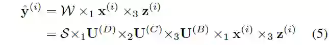 公式3里的W是一个三阶张量,有着非常复杂的计算难度。所以我们首先对W使用Tucker分解,将W分解为如下形式: