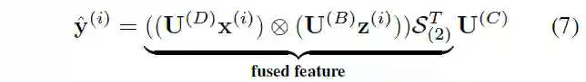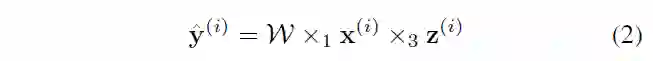 在这里,W是一个融合模型,一个D*C*B的三阶张量,x是D维特征向量,z是B维特征向量。y是最后标签,是一个C维向量,表示目标被分成C类。注意,公式2里的的乘法均为张量点积(tensor dot product)。所以,如果要对M个样本进行建模,求得一个最终的分量W的话,最终的目标函数即为: