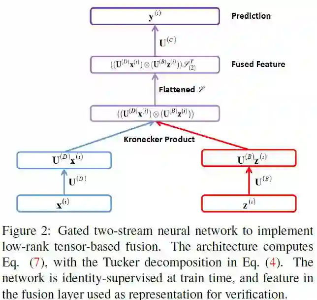 本文作者提出了一种基于张量的图像特征融合方法。证明这种张量融合方法和神经网络等价之后,作者直接使用神经网络来学习并得到最终融合后的特征。最后的实验证明,融合后的特征在MultiPIE,CASIA NIR-VIS2.0和 LFW 数据集上都取得了不错的效果。