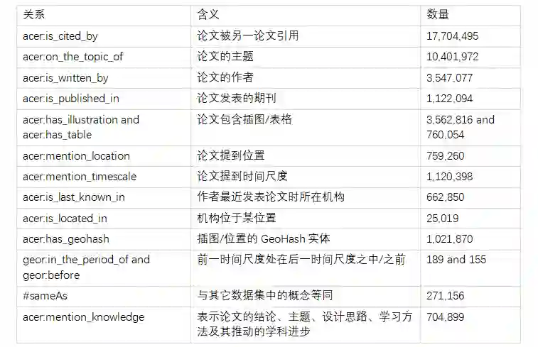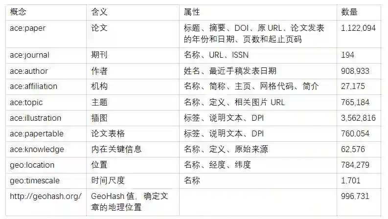 如前所述,GAKG 是⼀个⼤型多模态学术知识图谱,其中所有的数据均来⾃ AceMap (https://www.acemap.info/ )。GAKG的模式图由11个概念和19个连接概念的关系组成。每一个实体都有一个概念与之对应,并且具有一定的属性。具体概念相关信息如表 1 所示。
