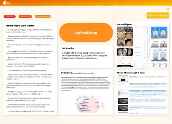一个学术的探索,要对领域的知识体系有全面的认识,并且也要清楚了解知识体系中的各类知识点涉及的论文、年代和地理位置信息。GAKG-Navi提供了由地学专家人工挑选的地学全知识体系的可视化,同时每个知识点关联了相关的论文、图片、表格、百科知识和数据集,并对相关的文章给出机器生成的总结摘要。用户可以在此独特的系统中进行知识点的遨游和穿梭。
