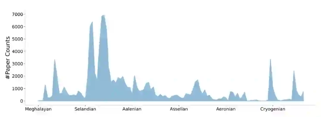 我们开发了基于规则的增强信息提取方法,提取了论文标题、摘要和导论中提到的地理年代信息的实体。根据地理时代词在论文中的位置以及前后出现的词,计算置信度得分并选取达到一定阈值的。论文的地址时间尺度分布如图2所示。
