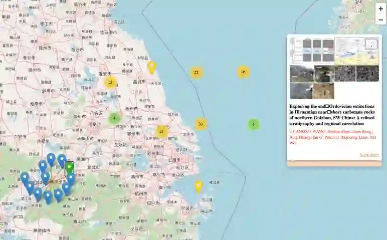 在进行地学知识的探索过程中,要对文献在世界上的分布有充分的认识,GAKG-PaperOnTheMap提供了基于Paper关联POI的数据,每篇文章谈论涉及若干地点,本系统通过GPE抽取和经纬度坐标抽取将论文与地理信息系统关联起来,联同论文谈论的年代信息,给学者以时空维度的论文检索体验,方便学者对地学知识进行探索。