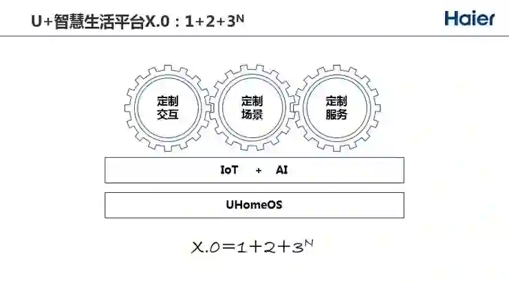 归纳来说是U+智慧解决方案平台是“1+2+3”能力,1代表UHome操作系统,基于微内核(Microkernel)在上面做各种各样的适应层,可以适应安卓、Linux,可以兼容背后的服务生态,这是一个国家级的平台,海尔牵头做这个国家重大专项。2代表AI+IoT双引擎,为联网家电提供互联互通,人工智能提供决策和判断。3代表各种各样为用户体验定制的能力,包括交互能力、场景能力和服务能力。