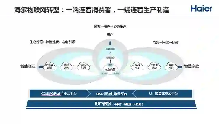 海尔从只是生产硬件的制造商转变为平台型企业,要做的是“硬件+软件+服务”。背后有三大平台:一是CosmoPlat工业云平台,107个工厂互联互通,通过传感、机器自动生产,和前面的需求完全匹配;二是OSO顺逛社群云平台;三是U+智慧生活平台,包括产品互联互通、云服务、人工智能处理数据,主动推荐解决方案。