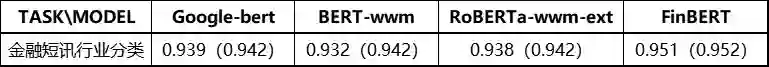为了对比基线效果,我们从熵简科技实际业务中抽象出了四类典型的金融领域典型数据集,包括句子级和篇章级任务。在此基础上,我们将 FinBERT 与 Google 原生中文 BERT、哈工大讯飞实验室开源的 BERT-wwm 和 RoBERTa-wwm-ext 这三类在中文领域应用广泛的模型进行了下游任务的对比测试。在实验中,为了保持测试的公平性,我们没有进一步优化最佳学习率,对于四个模型均直接使用了 BERT-wwm 的最佳学习率:2e-5。
