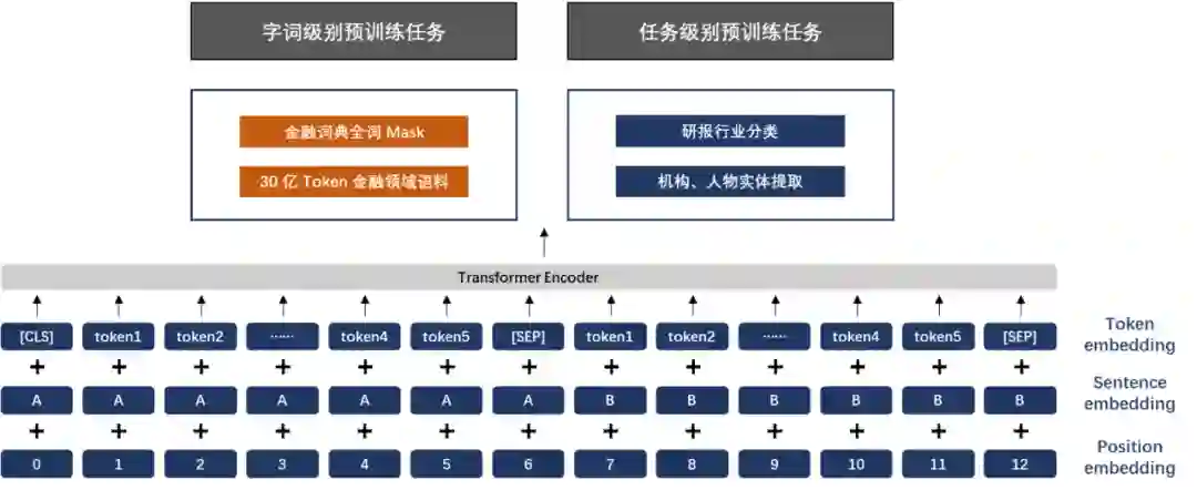 为了让模型更好地学习到语义层的金融领域知识,更全面地学习到金融领域词句的特征分布,我们同时引入了两类有监督学习任务,分别是研报行业分类和财经新闻的金融实体识别任务,具体如下: