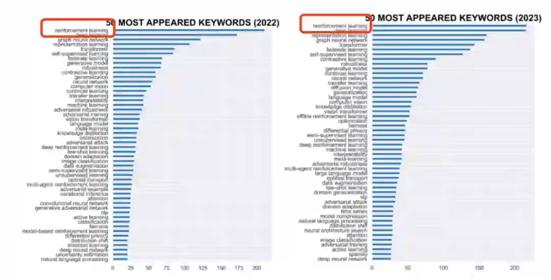 2022 年和 2023 年 ICLR 论文投稿关键词频率比较(引自AI科技评论)