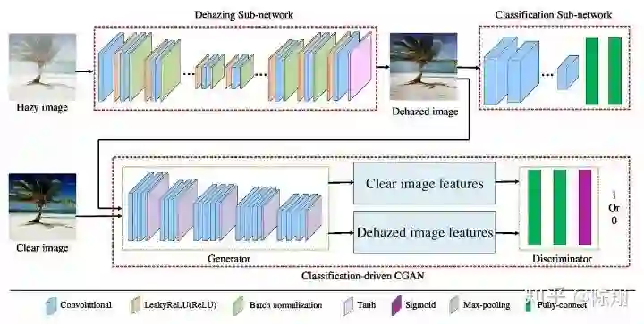 为此,作者提出了一个统一的CNN架构,其中包括三个部分:除雾子网(DNet),分类驱动的条件生成对抗网络子网(CCGAN)和与图像分类有关的分类子网(CNet),它们在视觉吸引力和图像分类方面都有较好的表现。