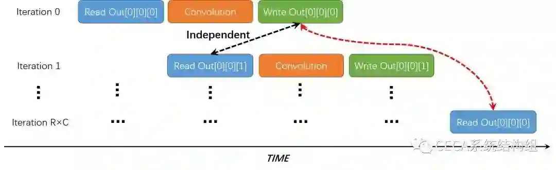 通过观察我们可以发现:Out 数组的在程序中的访问位置,只和 r、c 这两个循环变量相关,而和 kr、kc 无关。我们可以利用这一点解决 RAW 数据依赖的问题。为了能将内层循环的计算完全流水化,我们决定将 Kernel Row 和 Kernel Column 两重循环移到外层。如下图所示,将循环流水化时,相邻 Iteration 所访问的 Out 数组的数据位置是不同的,不存在数据依赖,可以流水执行;而有 RAW 数据依赖的 Iteration 将在很远的时间点发生 (R×C 个 Iteration 之后),此时对于该位置的写操作早已完成,读操作可以正常进行。这样一来,我们实现了一个完全流水化的硬件架构,提升了加速器的整体处理性能。