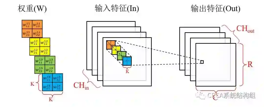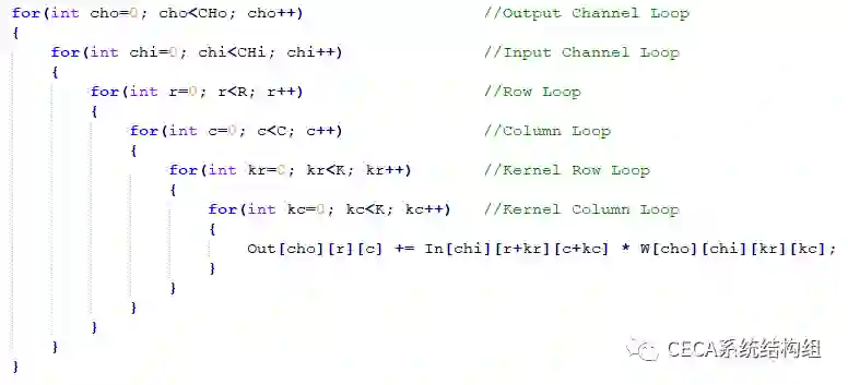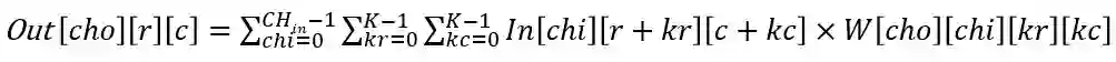 整个卷积层的输入是 CHin 张输入特征图,输出是 CHout 张输出特征图,每张输出特征图的大小为 R×C。由于每一个「输入-输出」特征图对都有一个特定的卷积核用于卷积计算,所以总共有 CHout×CHin 个卷积核,每个卷积核的大小为 K×K。在进行卷积计算的过程中,每个卷积核滑过各自的输入特征图,并使用当前滑过的窗口中的输入特征与卷积核内的权重完成卷积计算 (对应位置相乘,所有乘积累加),卷积的结果会累加到对应位置的输出特征上。因此,卷积计算的算法流程如下式所示: