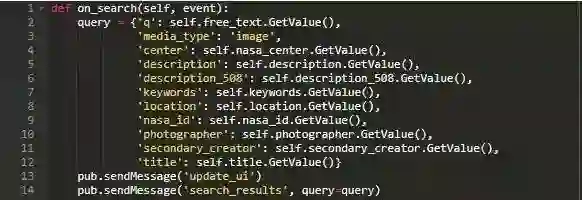 最后,将sizer设置为main_sizer。注意,并非所有NASA API中的过滤器都在此代码中实现。例如,我并没有添加media_type,因为此应用只用于图像搜索。但是,如果需要搜索视频或音频,可以更新此程序。此外,year_start和year_end也未实现。如果需要,可随时添加。