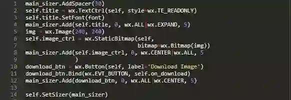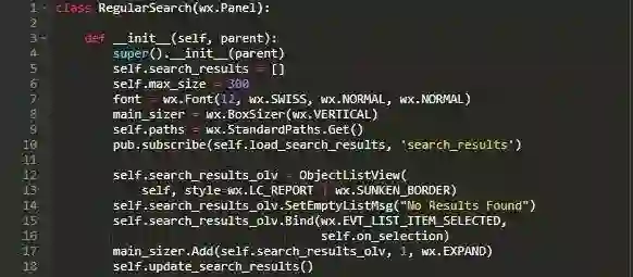 此代码将search_results列表初始化为空并设置图像的max_size。它还设置了一个sizer和ObjectListView部件,用于向用户展示搜索结果。当所有类组合在一起时,代码实际上非常类似于代码的第一次迭代。