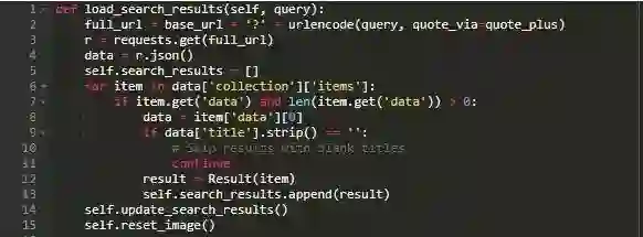当使用pubsub时,将调用load_search_results()方法。main和advanced_search模块通过传递请求参数来调用,然后将结果编码为格式化的URL。接下来使用requests发送JSON请求,然后提取结果。此时也会调用reset_image()方法,以便在加载一组新结果时,不会选择任何内容。