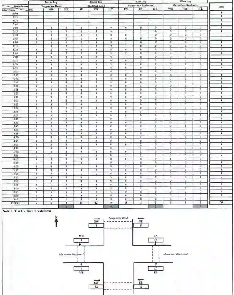 交叉口转向交通流量(Intersection Turning Movement Counts,简称TMC),统计机动车左转、直行、右转、调转的车辆数,同时包括行人和自行车。典型的十字交叉口,不包括调转车辆,车流共有十二个运动方向,即每个进口的左转、直行、右转。在统计流量时,一般不分车型记录,但会统计重型车辆的百分比例,而行人和自行车单独列表统计。重型车辆通常包括四个轮胎以上的任何车辆,例如半拖车或牵引拖车等;摩托车通常被视为轿车,因为它们在交通中的行为与轿车相同;在某些特殊情况下也会对车辆做特别的分类,例如公共汽车或马车等。