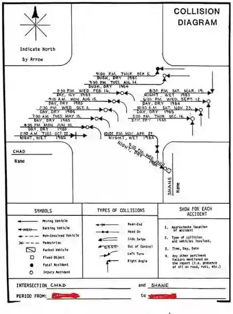 交通调查需要的事故数据一般包括事故发生日期、时间、地点、天气、地面干湿或是否有冰雪,以及车辆数、车辆行驶方向、碰撞角度和形式等。如果事故涉及行人或自行车,还需要知道行人或自行车所在位置、行走方向及与机动车的碰撞形式等。图9是美国警察常用的事故记录单,要写清楚碰撞部位、怎么碰撞的、事故发生地点,如街道名称等,还要描述事故车辆当时的行驶路径、车辆注册情况等。美国不同州警察会用不同的记录模式,但大致内容相同。