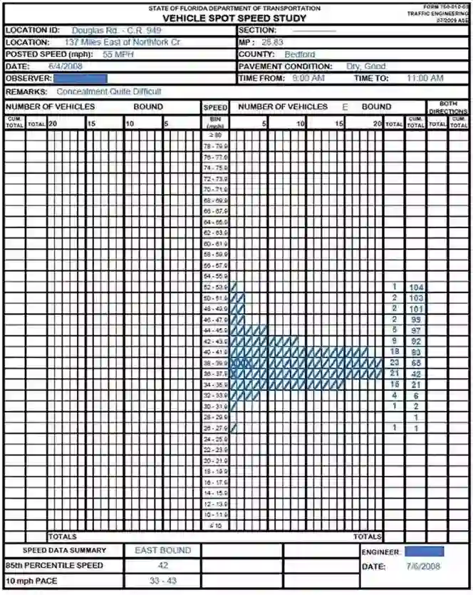 选择的地点应能观察到双向行驶车辆,同时避免驾驶人注意到雷达测速器和工作车辆。一般来说,驾驶人看到测速行为时往往会降低行驶速度,以避免被执法人员查处。因此工作车辆应停放在隐蔽处,便于采集良好的自由流样本。采集速度数据通常记录在速度-车辆数表格中。