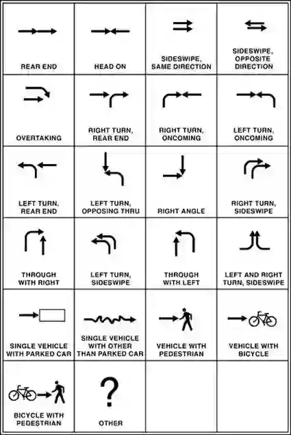 与国内略有不同,美国交通事故记录中关于碰撞方式有更细致的区分,除了常见的追尾、迎头相撞等,还会根据来车方向不同做更具体的划分,方便查看事故记录时能快速、清楚地知道事故碰撞的形式及车辆行驶方向。
