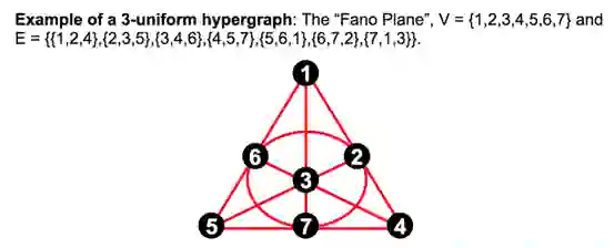 在图结构上,一般的边由两个节点所定义,而超边则可以由三个或更多的节点所定义,例如下图就是一个每条边包含三个节点的三阶超图: