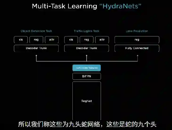 摄像头传进来的数据,会利用RegNet残差网络和BiFPN算法模型统一处理,得出不同精度下的图像特征,供给不同需求类型的神经网络任务。