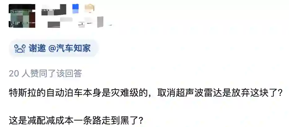 对于超声波的移除,网友认为特斯拉自动泊车功能本来就是灾难级的,这次官宣放弃明显是减配减成本一路走到黑。