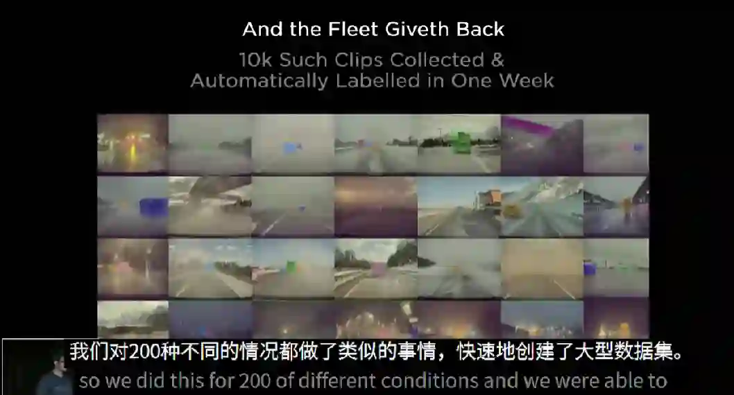 特斯拉还搭建了自动标注流水线,用45秒-1分的视频,包括大量传感器数据,交给神经网络离线学习,随后用大量机器和人工算法,生成可以训练的数据。包括3亿个图像和近50个标注。