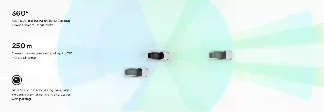特斯拉官网也介绍道,8个摄像头和强大的视觉处理能力可实现360度视野范围,对周围环境的监测距离最远可达250米。