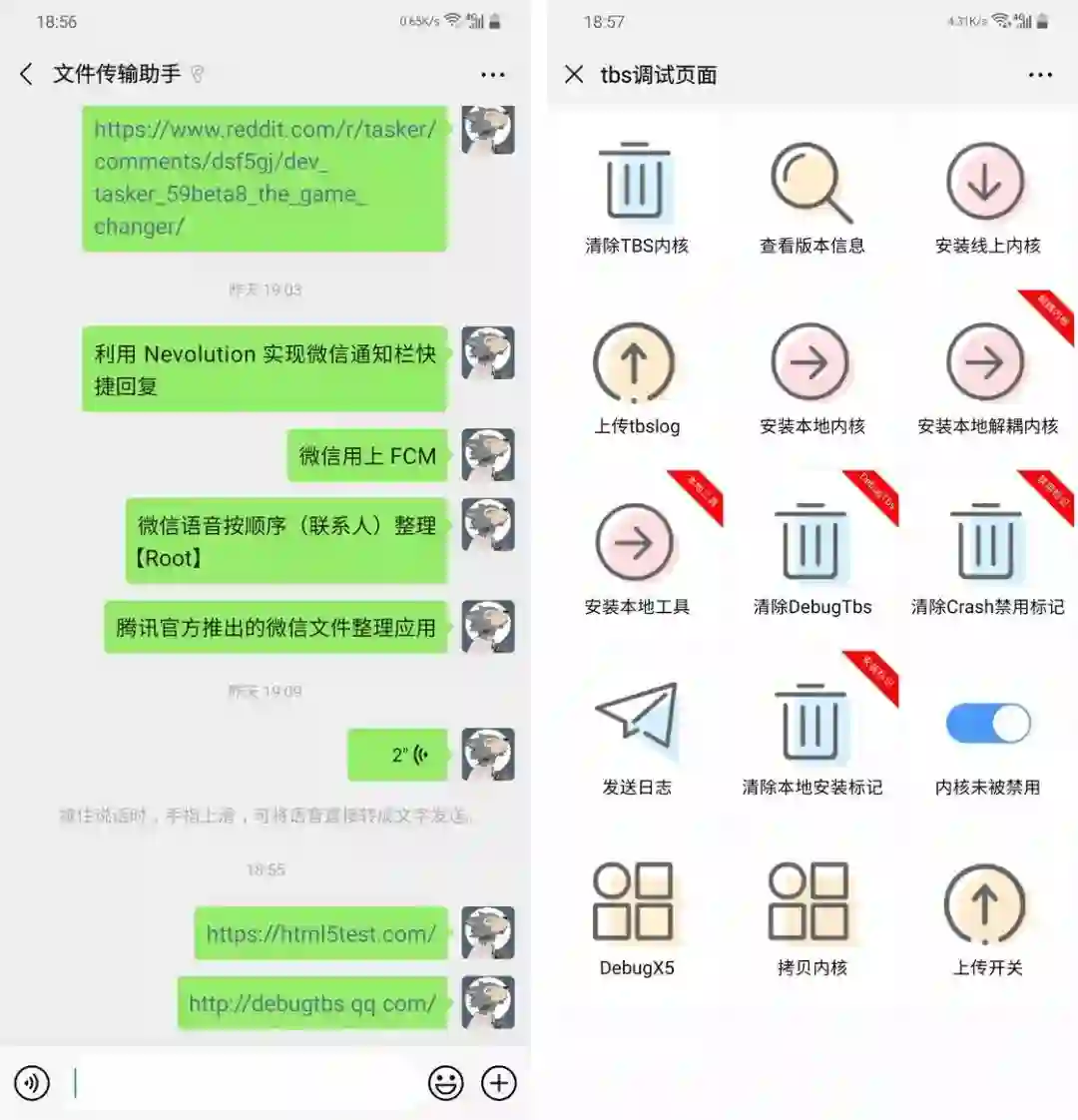 更改方法也非常简单,在微信任意对话框内输入网址 http://debugtbs.qq.com/(注意是 http:// 而不是 https://)然后发送出去,推荐发送到文件传输助手,接着在微信内打开这个网址,即可进入微信的 tbs 内核调试页面: