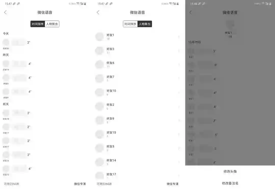 腾讯文件自带微信语音管理:点击应用首页的「微信文件 - 语音」,就可以看到所有人的微信语音了,点击单条微信语音可以直接播放。默认是按照时间顺序排列,不会显示用户名称(微信本身限制,语音是用户名加密后存放在本地的),但是提供了按用户分类微信语音,可以自己根据听到的声音在用户头像那里设置备注,算是比较简单直接的微信语音管理。