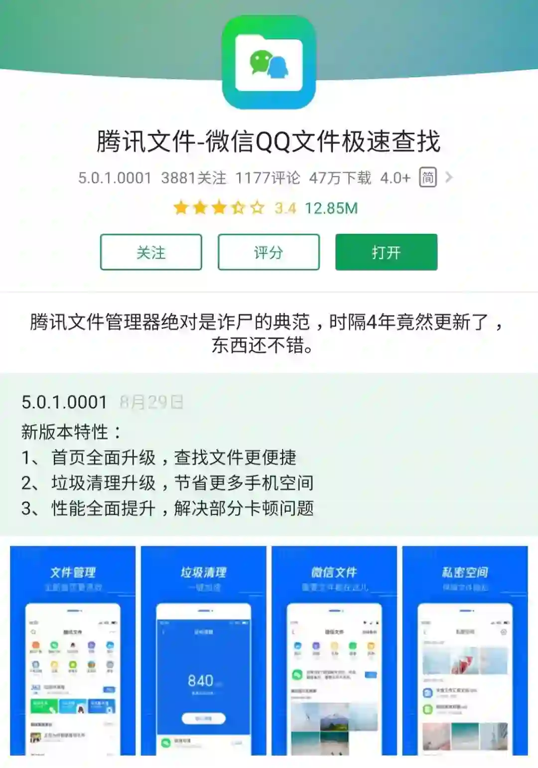 俗话说「自家人懂自家事」,我们想要清理这些数据,优先考虑的当然就是腾讯自家的清理应用。正巧的是腾讯还真的有这这样的一款应用 —— 腾讯文件。这款应用已经好久没有更新过,但是最近腾讯好像突然想起来自家还有这样一款应用,发布了一次更新: