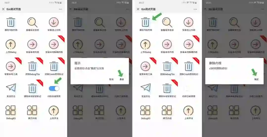 接着我们点击「内核未被禁用」开关并点击确定把内核关掉,页面会重启一下,然后再次进入内核调试页面点击「清除 TBS 内核」,就可以清除微信内置的 X5 内核了。